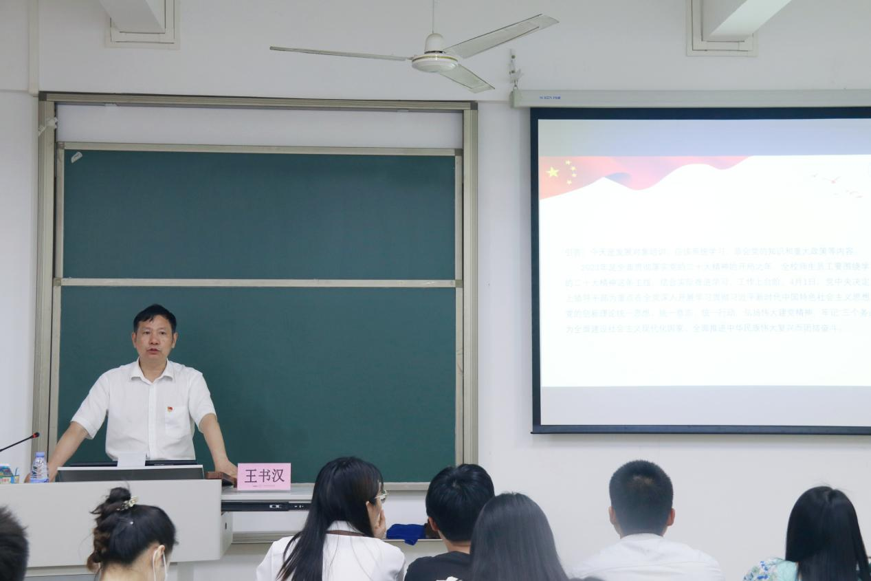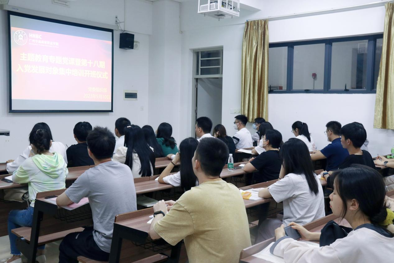 为深入开展学习贯彻习近平新时代中国特色社会主义思想主题教育,推动党的二十大精神在我校落地生根、开花结果,2023年5月10日,我校在1-103课室举办主题教育首场专题党课暨第十八期入党发展对象集中培训开班仪式。