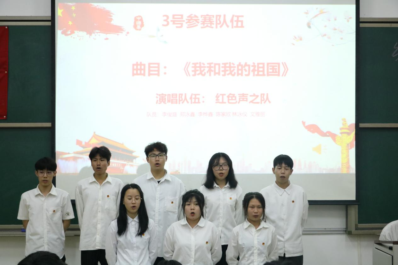 9支参赛队伍着装整齐,步调一致,以饱满的精神,逐一上台展示。一首《渴望光荣》拉开比赛的序幕,一首《没有共产党就没有新中国》唱出了中国共产党的百年奋斗征程,一首《我和我的祖国》彰显了当代青年对祖国的热爱,合唱歌曲《不忘初心》以气势磅礴的歌声和动听优美的旋律歌颂着中华民族自强不息的伟大精神、阔步向前的豪迈气概,将现场氛围推向了高潮。