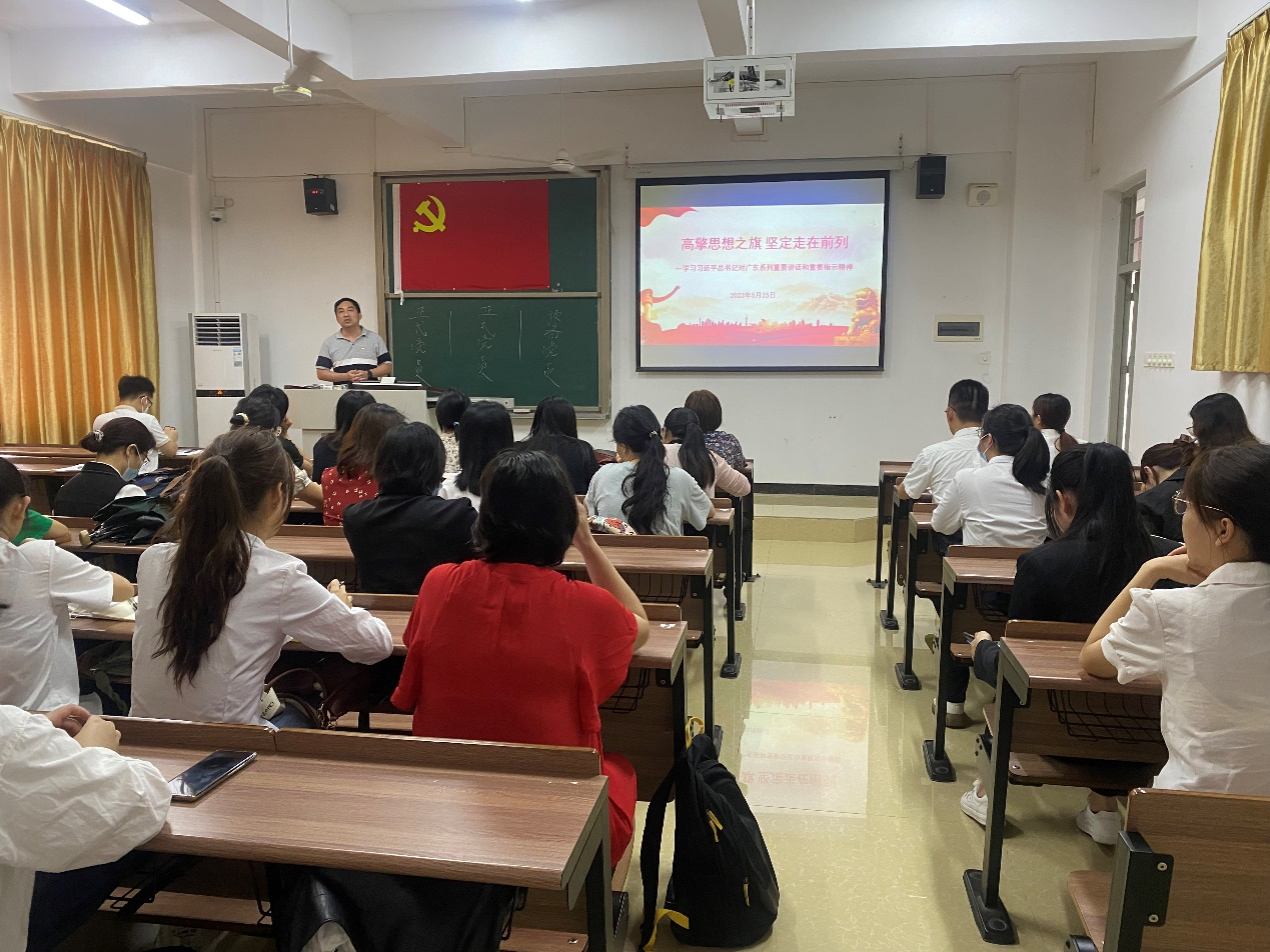 为深入学习贯彻习近平总书记视察广东重要讲话、重要指示精神,推动主题教育持续走深走实,5月25日下午,新商务外语学院党总支坚决贯彻执行学校党委工作部署,组织召开“走在前列建新功”主题学习会。会议由教师党支部书记田夕伟主持,党总支副书记蔡天奎作中心发言,全院师生党员参加研讨学习。
