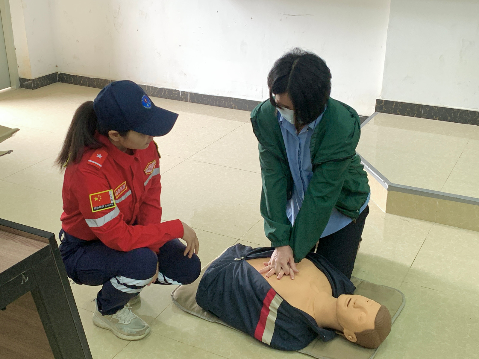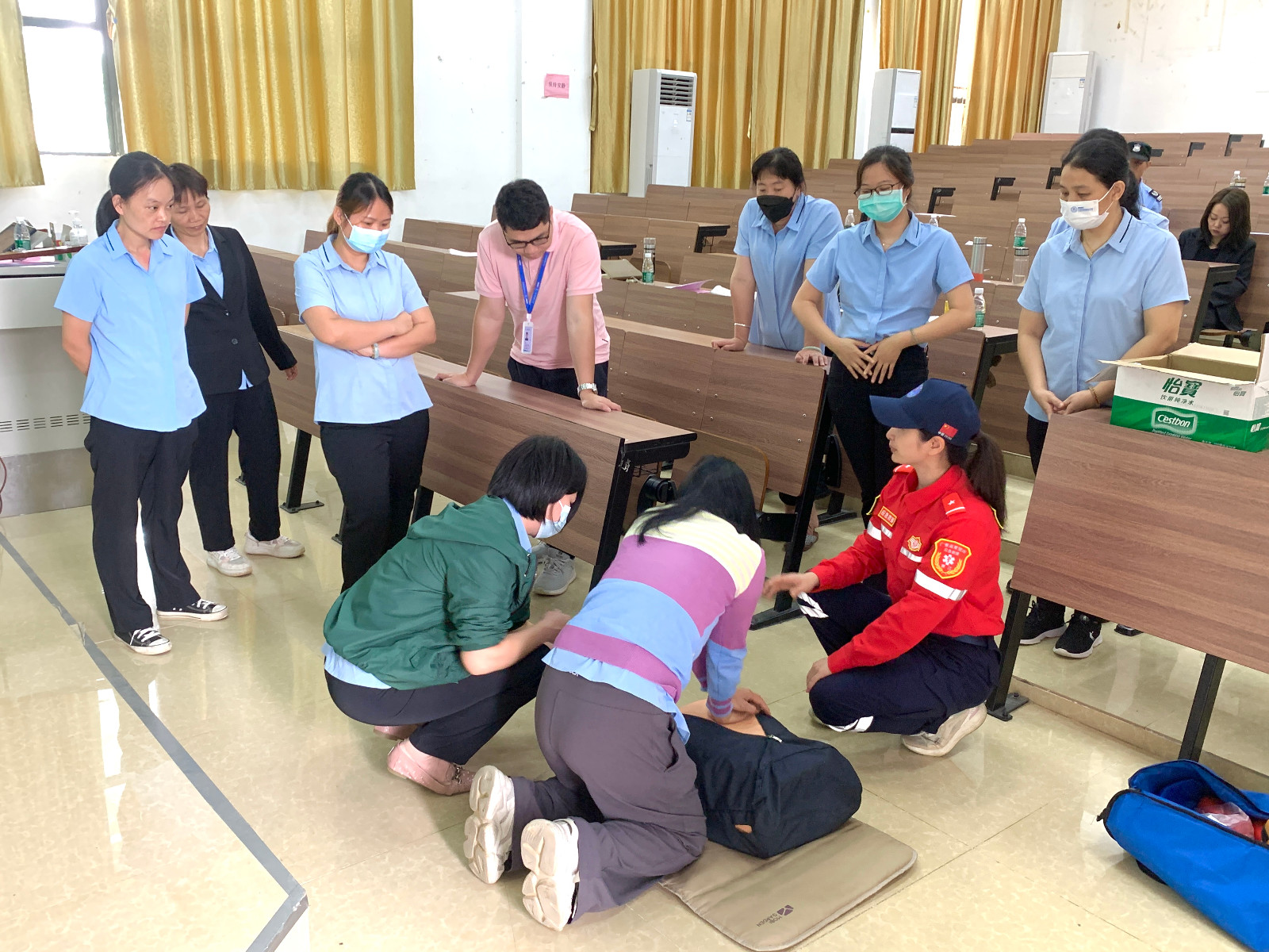 黄海霞导师和李春志导师以其丰富的专业知识和实践经验,为大家详细地讲解了心肺复苏(CPR)、海姆立克急救法、止血包扎等理论知识,并示范操作步骤。
