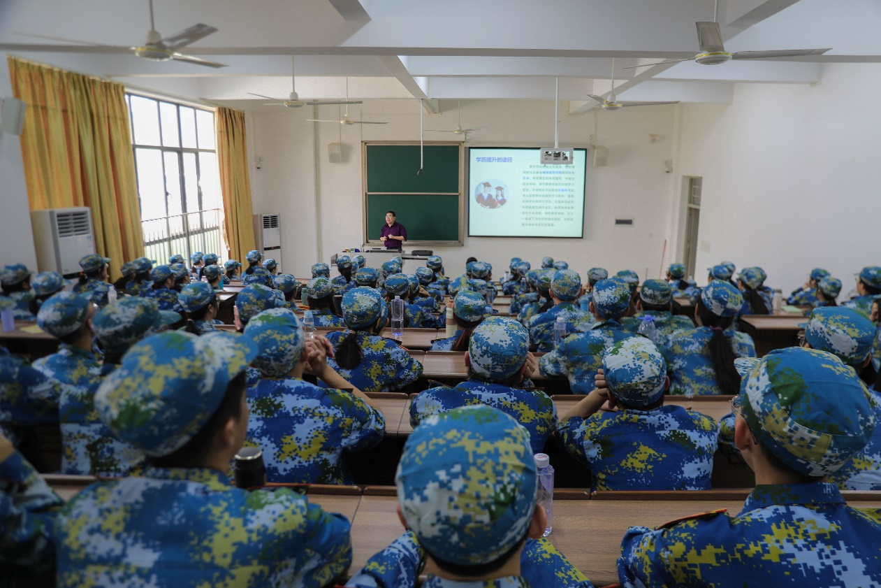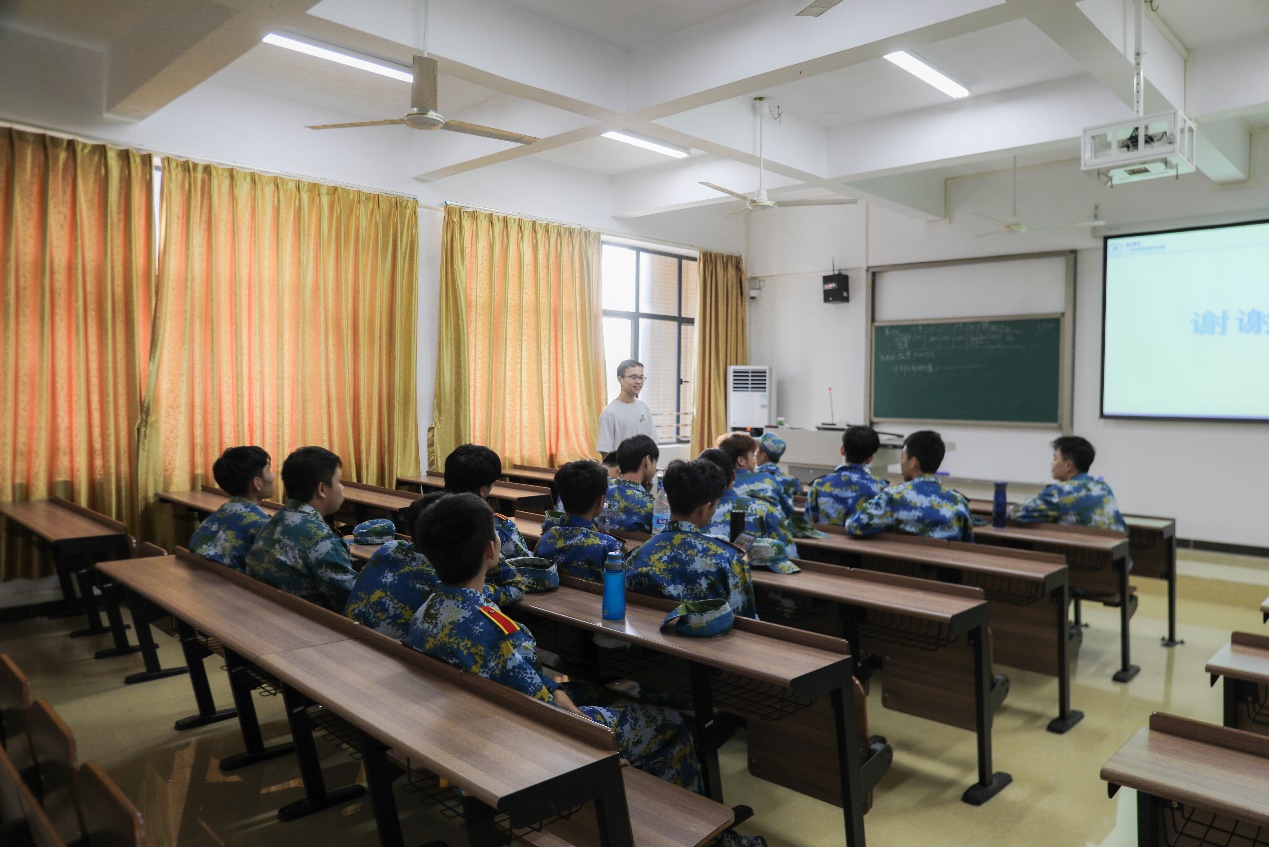 2017级工管3班胡文星以优秀毕业生的身份向新生分享华贸成长经历,他向学弟学妹们生动的分享了自己是如何从一名高考失利,性格软弱的游戏宅男成长为一名优秀士兵、优秀学生干部,成功通过专插本考试进入广东财经大学的经验。