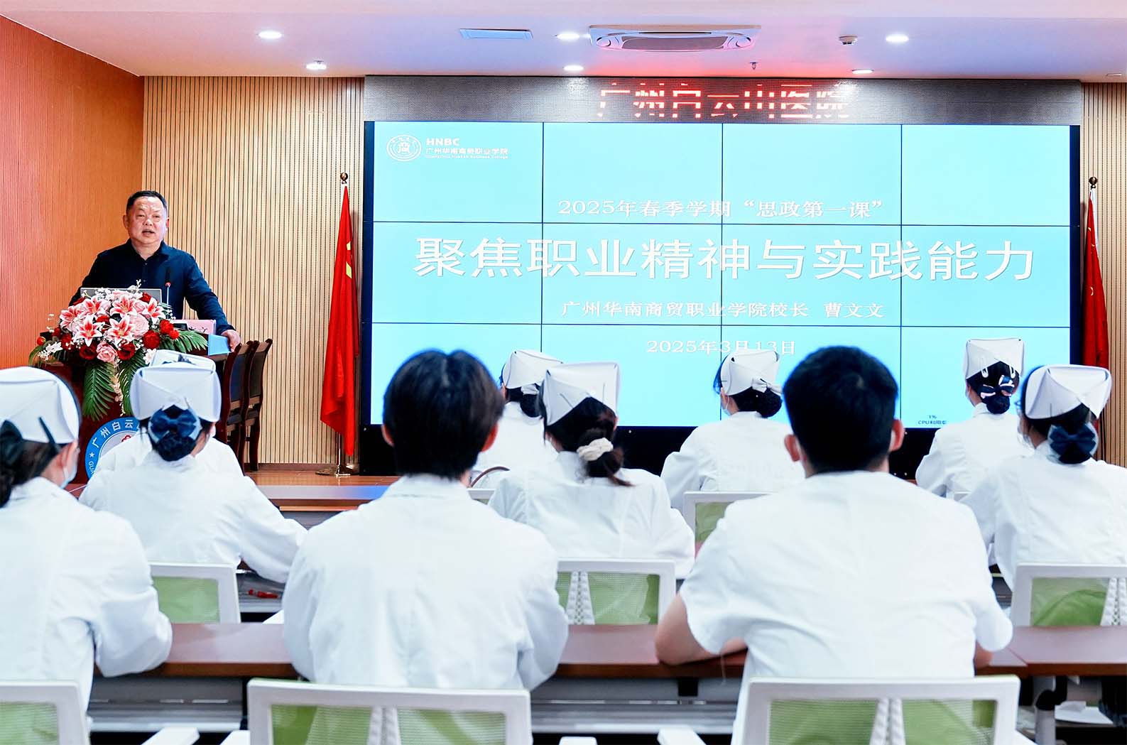 3月13日,广州华南商贸职业学院(以下简称“华南商贸”)校长曹文文、党委书记王书汉,分别走进广州白云山医院和南方医院太和分院,为卫生健康学院护理专业实习学生代表讲授“思政第一课”。