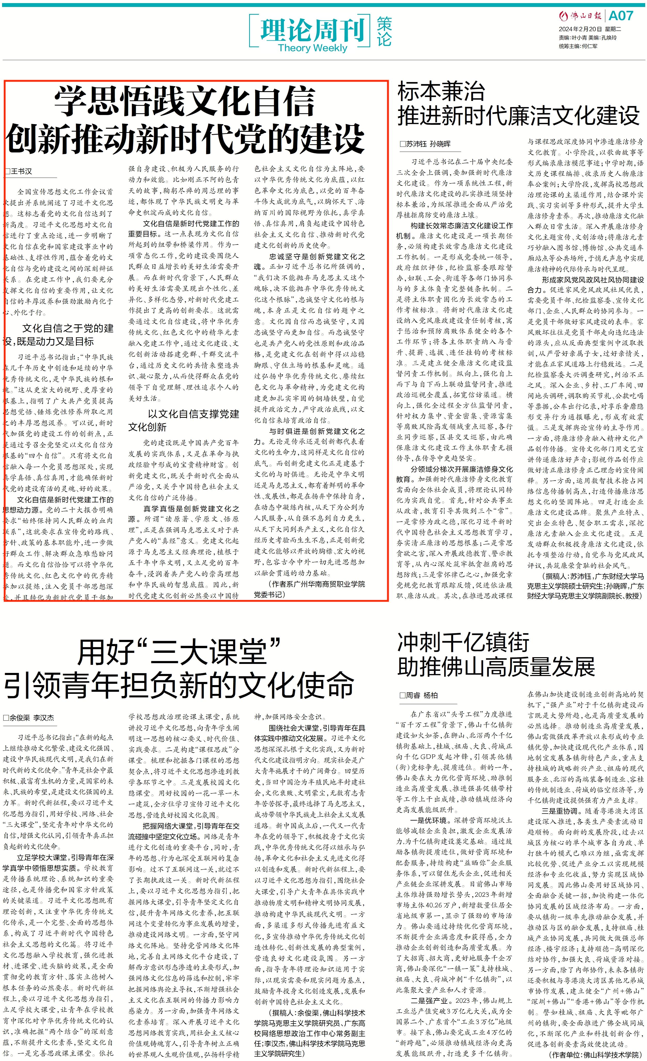 佛山日报:全国宣传思想文化工作会议首次提出并系统阐述了习近平文化思想。这标志着党的文化自信达到了新高度。习近平文化思想对文化自信进行了重点论述,进一步明晰了文化自信在党和国家建设事业中的基础性、支撑性作用,蕴含着党的文化自信与党的建设之间的深刻辩证关系。在党建工作中,我们要充分发挥文化自信的重要作用,让文化自信的丰厚汲养和强劲激励内化于心、外化于行。