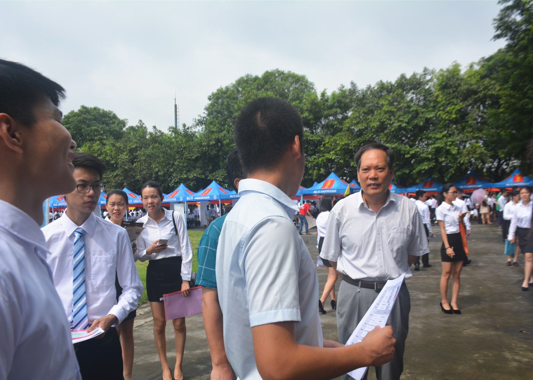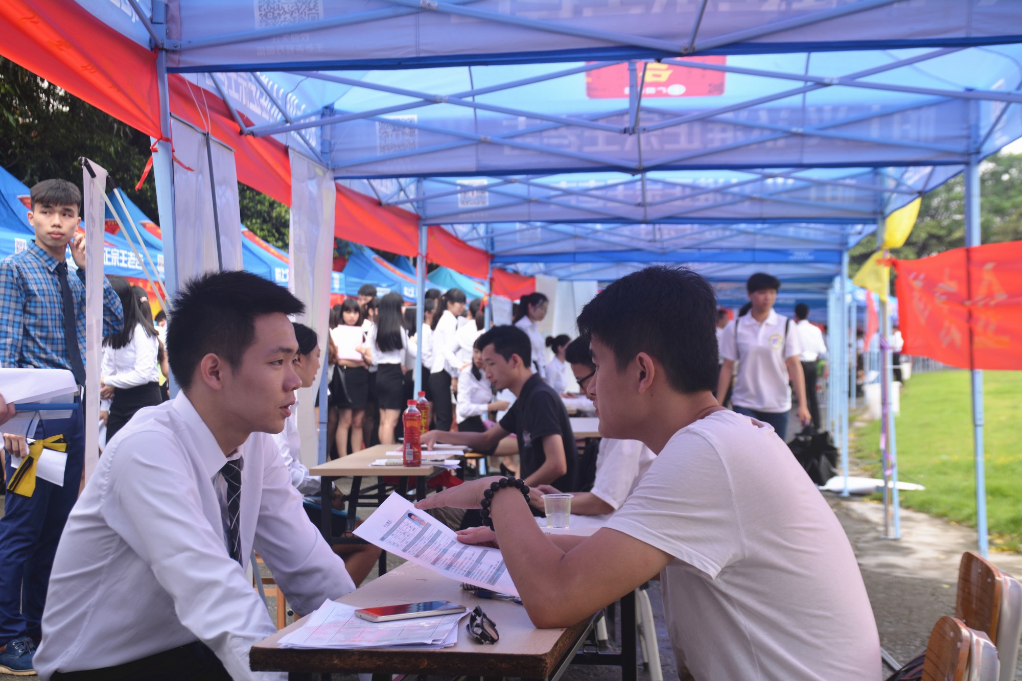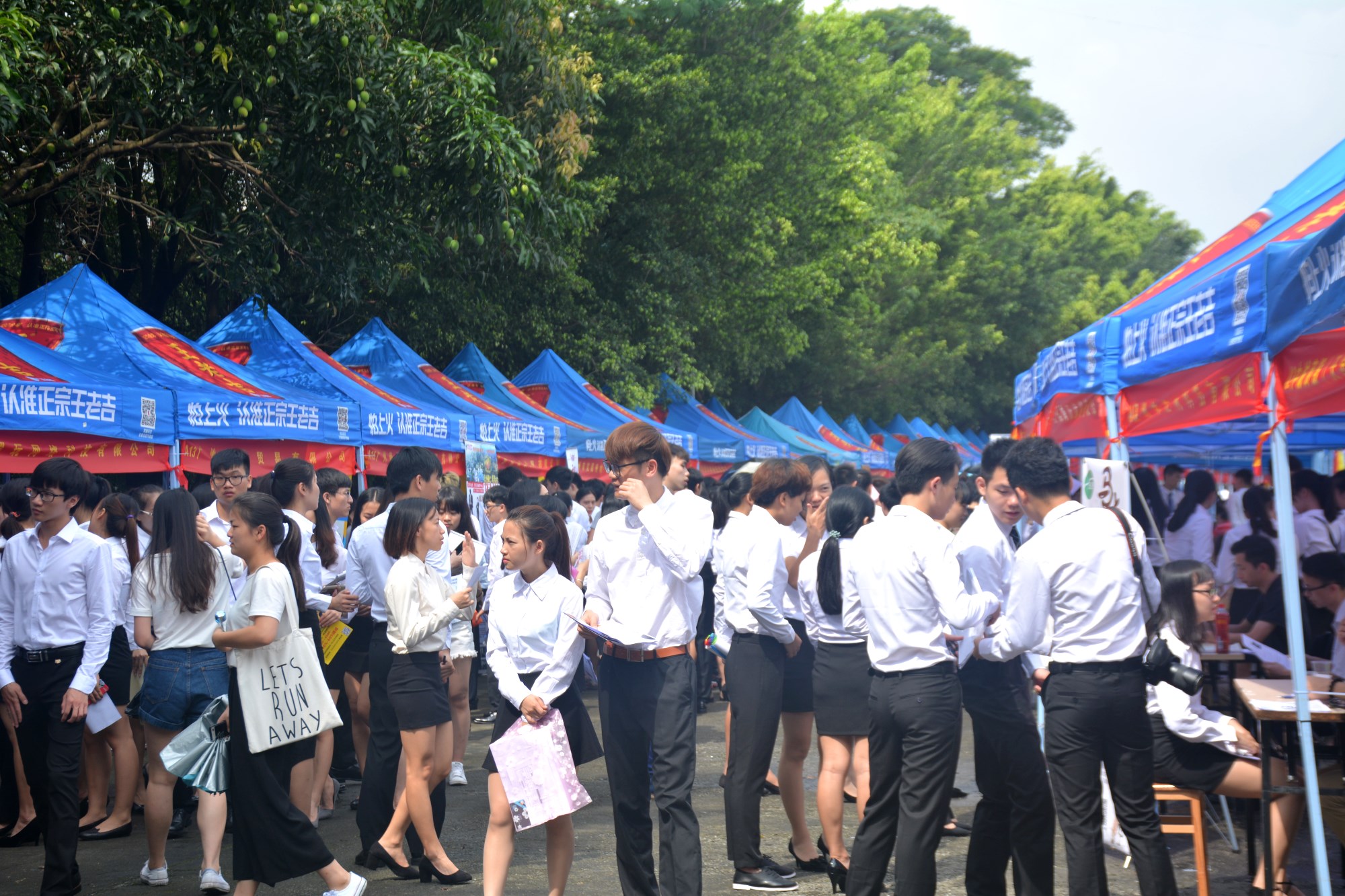 上午9时,供需见面会正式拉开序幕。学院足球场上热闹非凡,各招聘展位前人头攒动,学生们争相咨询并递交应聘材料。本次参展企业中不乏世界五百强企业和知名上市公司,还有往届毕业生的校友企业,共提供了科技、物流、电商、外贸、金融、影视、房产、电器、食品等领域近2000个职位。
