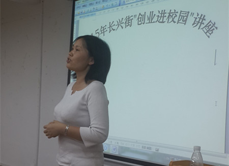 在热烈的掌声中,广州萨婆诃商贸有限公司总经理邓海荣女士开始了宣讲,她从自已的创业成功经历,深入浅出地讲述了创业的艰辛和创业成功的喜悦。她特别讲到要想创业成功,一定要有坚定的创业信念、明确的创业目标、坚持不懈的韧劲、敢想敢创的思想。只有这样,才能从日常生活中发现商机,找到创业的灵感。邓女士的讲话赢得同学们的阵阵掌声。随后,邓女士还和学生进行互动,一一解答了同学们的创业咨询。