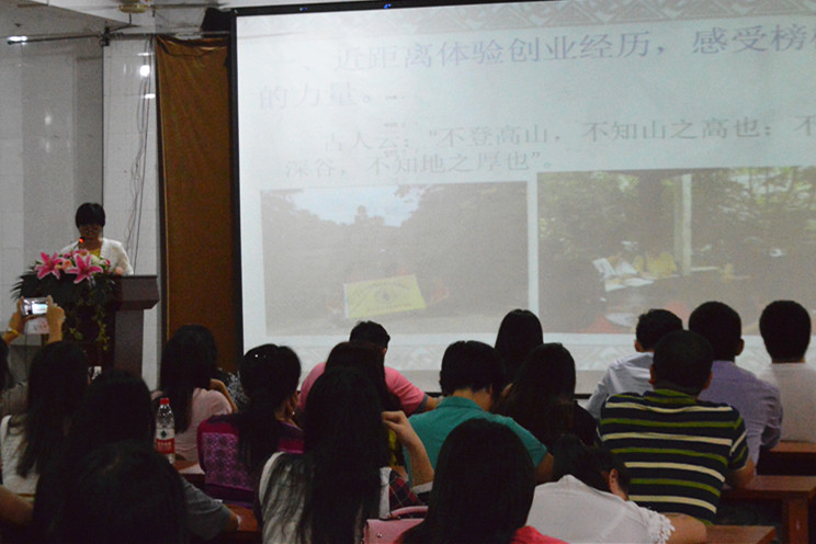大会在党委组织部副部长李植美同志的主持下分四个部分进行。首先,播放社会实践活动的视频,重现了社会实践服务队在广宁八一生态农场开展为期五天的社会实践的历程,得到与会者的热烈反响。接着,李植美同志代表服务队围绕“大学生体验创业:服务回报社会”主题,从“近距离体验创业经历,感受榜样的力量;深入基层,开展调研工作;交流创业思想,启发大学生创业励志梦想;理论联系实际,实现服务诺言”四个方面作了全面总结报告。