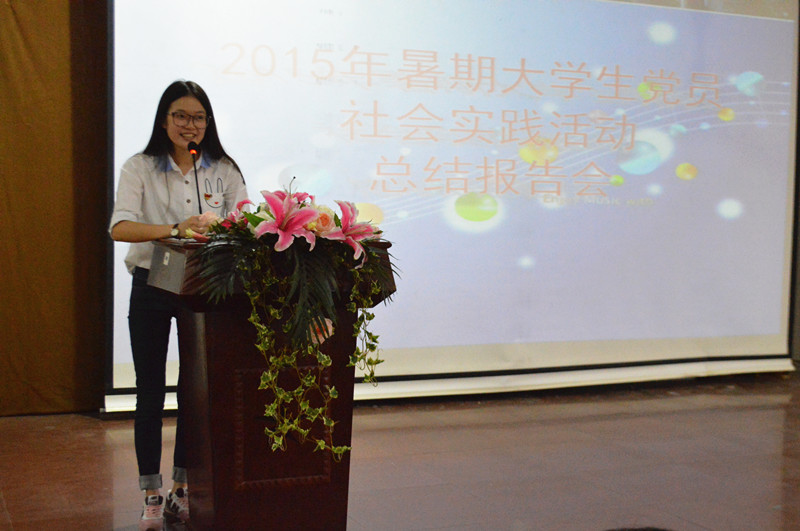 随后,五名参加社会实践服务队的学生党员及指导老师分别上台分享自己的心得体会。商务管理系曾鹏同学表示与八一农场贾书记的近距离交流和学习,使自己收获匪浅,对追求自己的创业梦想有很多的启发;来自贸易经济系的孙宁同学说:“这样的活动给我带来的影响是在校园和课堂上学不到的……”,非常庆幸自己有机会参加这次活动;信息工程系吴炳太同学说经过这次社会实践,自己更加坚定了作为党员服务群众的宗旨意识,要做到不忘初心、回报社会;财务会计系的黄奕璇同学说:“我们可以从贾书记身上学到敢于挑战,艰苦创业的精神,社会实践活动,在我踏入社会大门之前给我上了重要的一课……”人文与外语系唐瑛敏同学表示我们能够在即将走上社会这个大熔炉之前经历一次这样的体验,收益匪浅,服务社会将成为我们终生的课题。社会实践服务队的指导老师——商务管理系党总支书记马庆枝同志也分享了自己的收获和心得,她说这是自己第一次担任大学生党员暑期社会实践的指导老师,五天的社会实践启发了大家对创业、创新及服务社会的思考,学生们充分发挥了大学生引领社会潮流、掌握现代科技知识的优势,通过为“八一生态农场”注册、开通微信公众平台的方式,帮助农场追赶“互联网+”的时代步伐,用实际行动实现了服务社会的承诺。