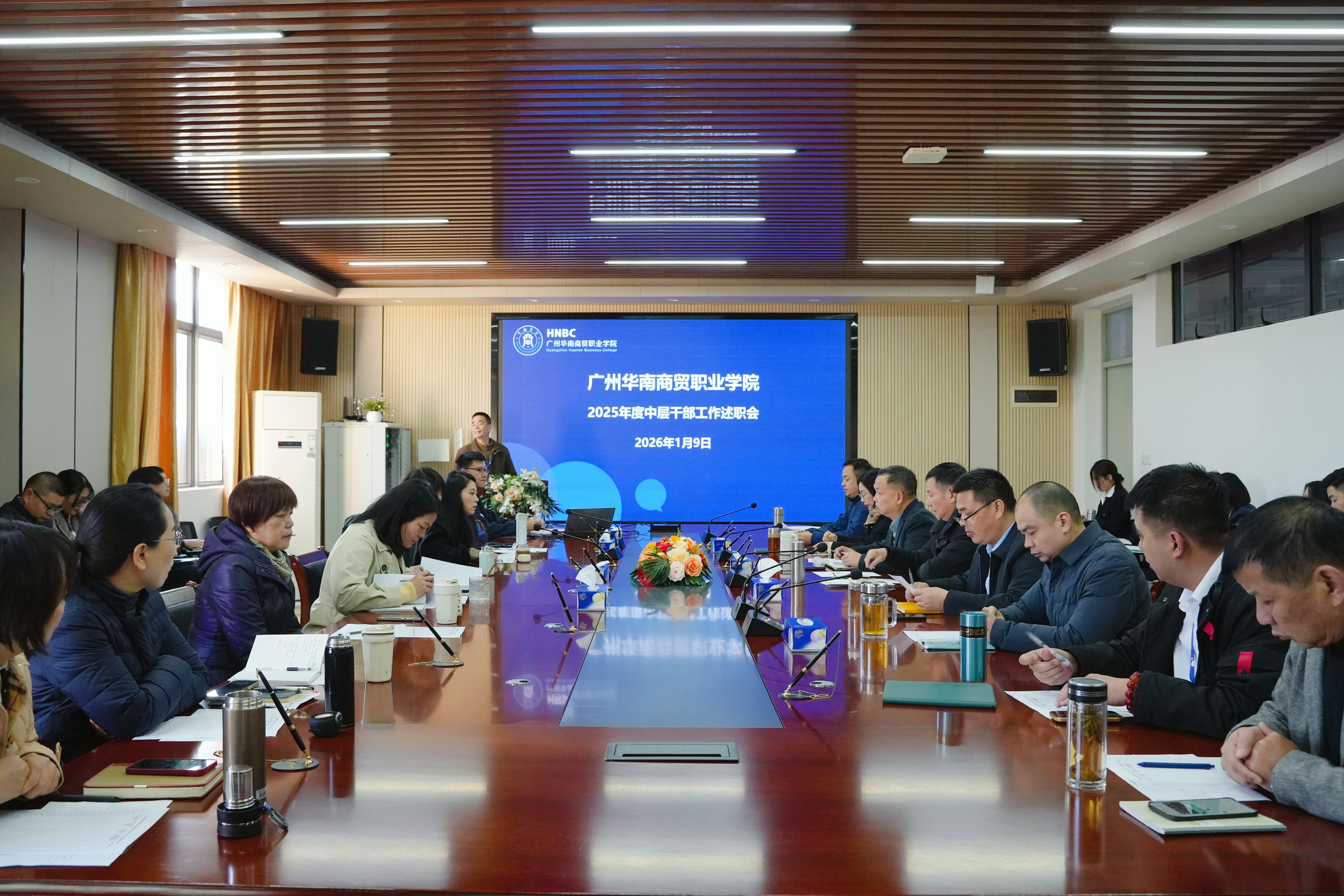 华贸讯:为更好践行南博集团企业文化,全面回顾总结2025年度学校各项工作,客观评价中层干部履职尽责情况,进一步加强干部队伍建设,提升管理效能与执行力,广州华南商贸职业学院于1月9-10日,集中召开了2025年度中层干部工作述职会,并紧接着举行了2025年度中层干部年终总结会。全体校领导、中层干部约30余人参加会议。